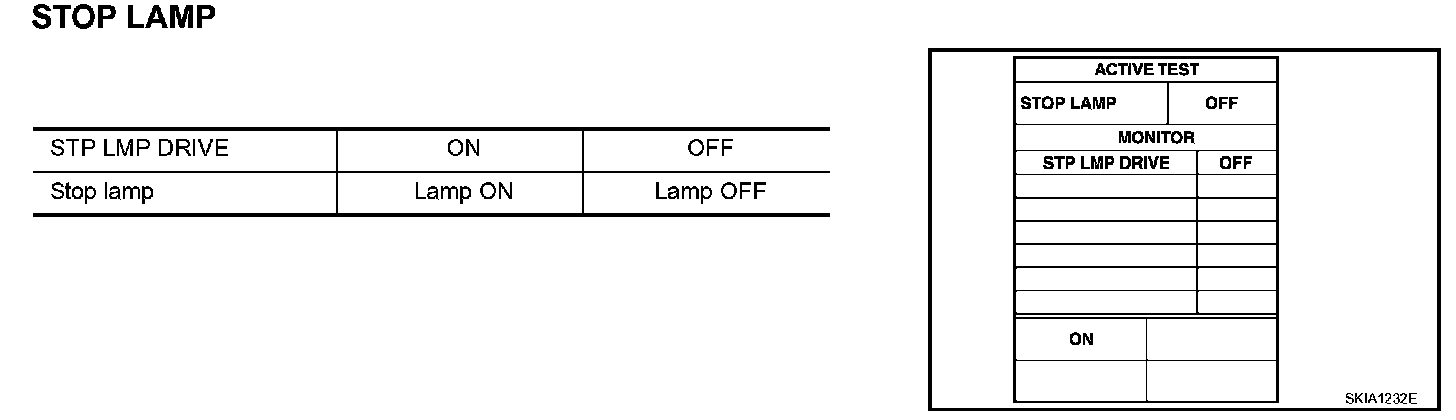 - Touch "ON" and "OFF" to check that stop lamp operates as in the given chart.