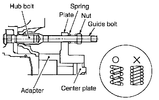 4. Insert the plate on the guide bolts. Put the spring in, and then evenly screw both guide bolt nuts. When fastening the guide nuts, do not completely compress the springs.