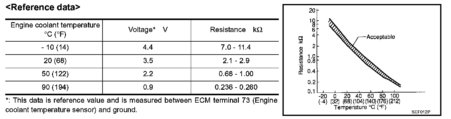 The engine coolant temperature sensor is used to detect the engine coolant temperature. The sensor modifies a voltage signal from the ECM. The modified signal returns to the ECM as the engine coolant temperature input. The sensor uses a thermistor which is sensitive to the change in temperature. The electrical resistance of the thermistor decreases as temperature increases.