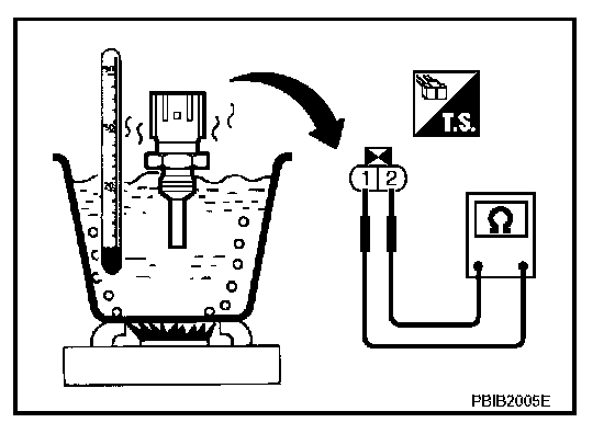 1. Check resistance between engine coolant temperature sensor terminals 1 and 2 as shown in the figure.