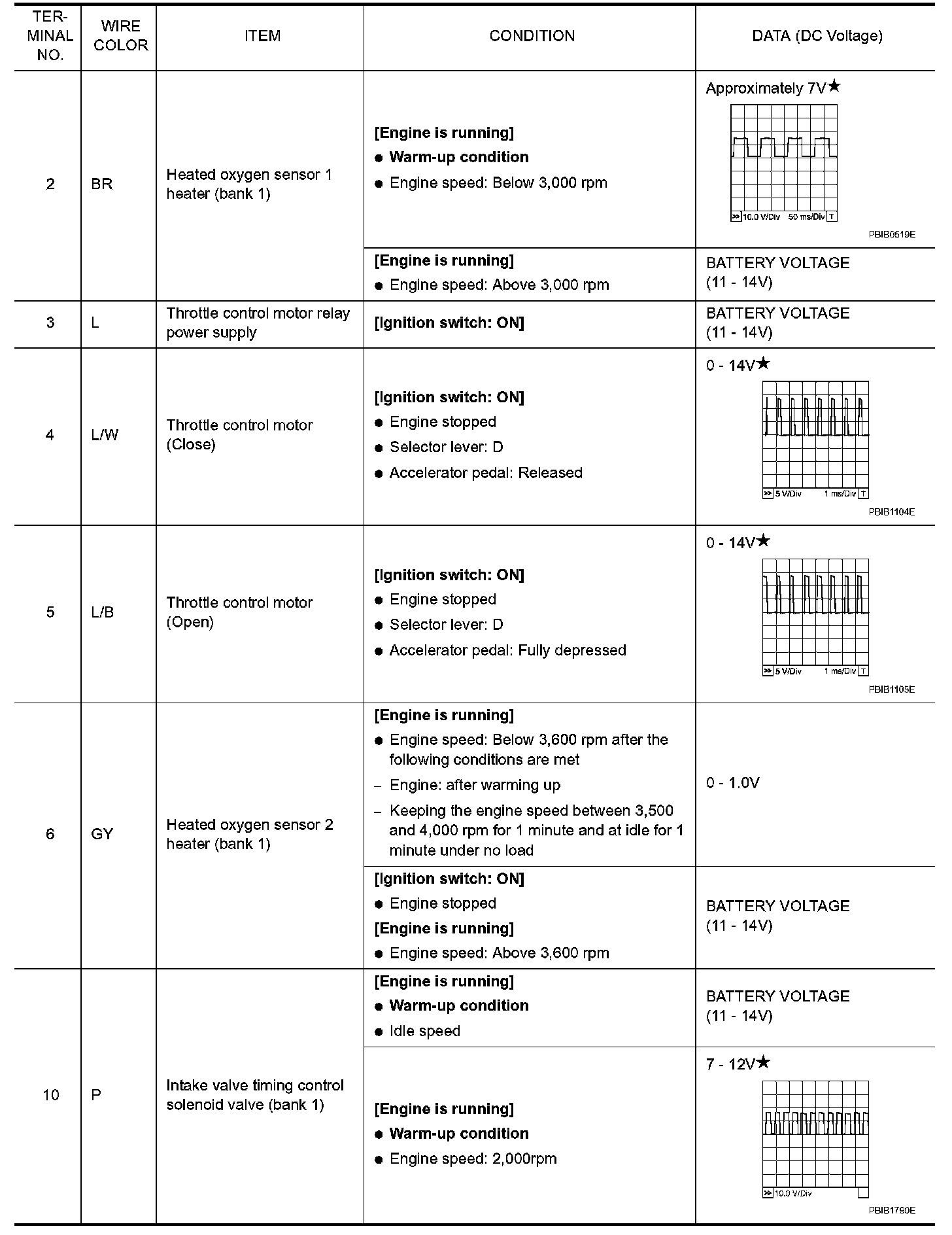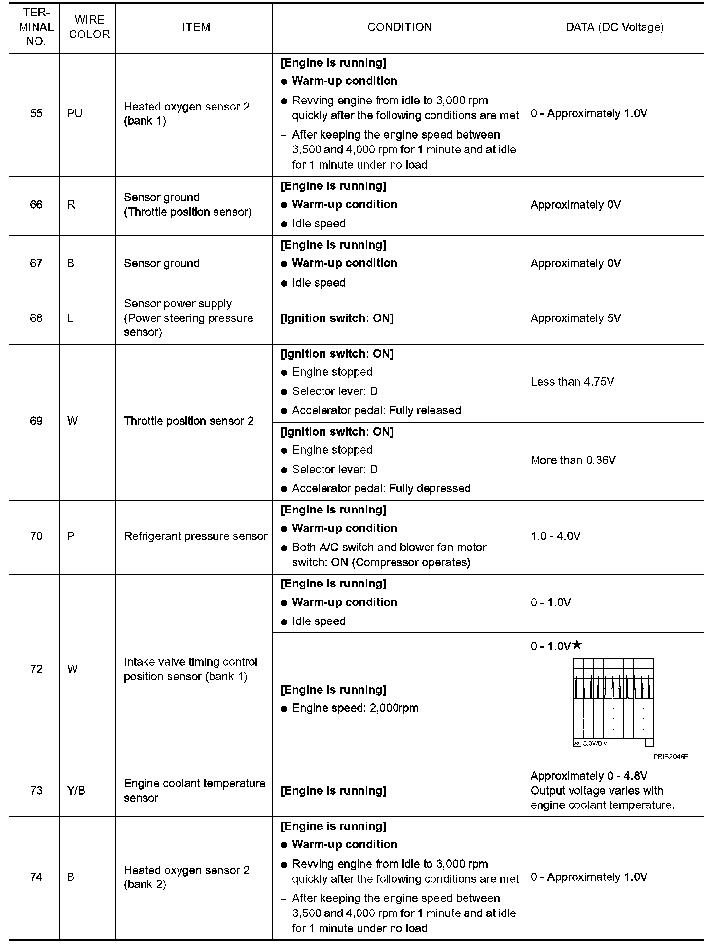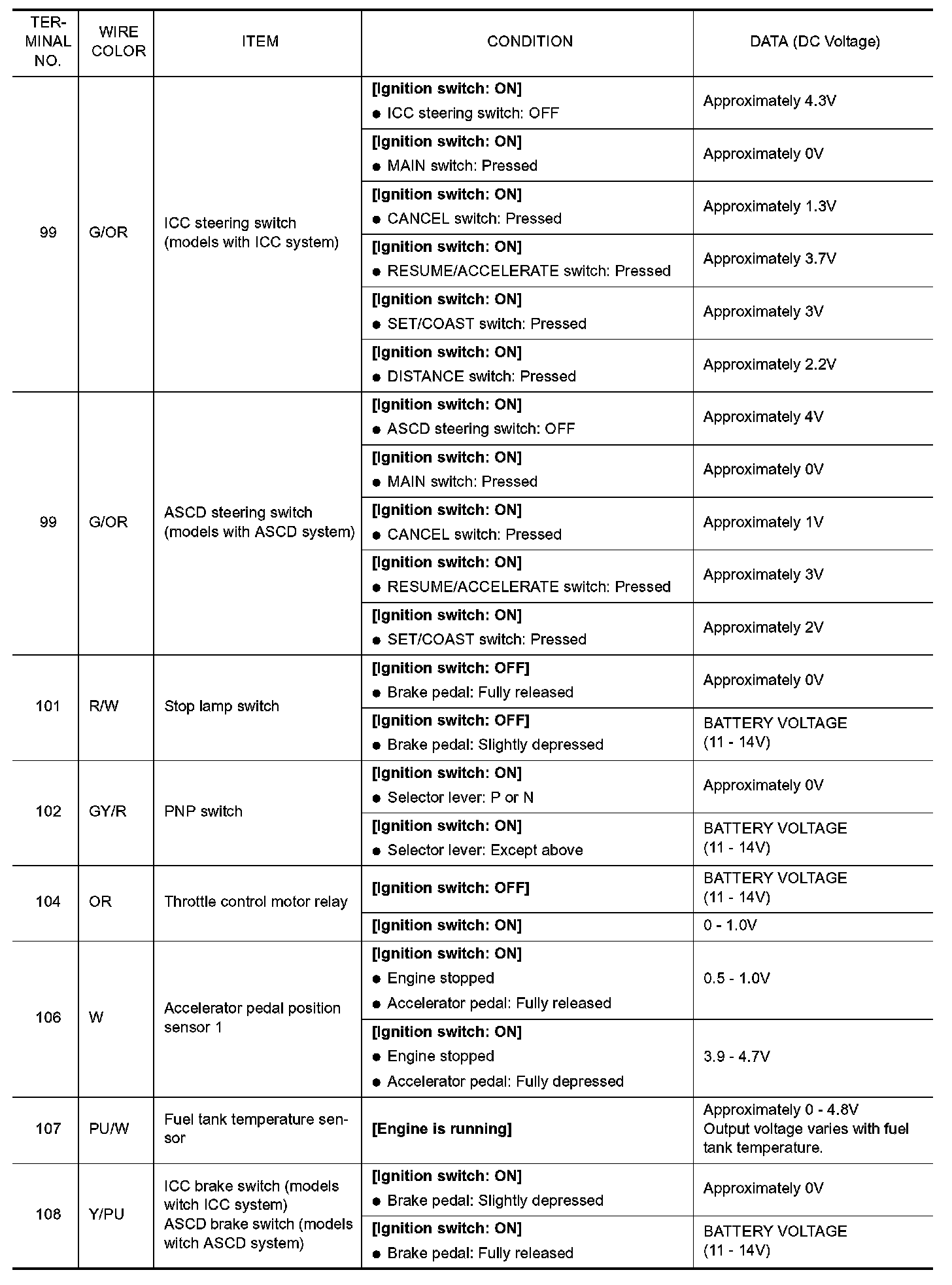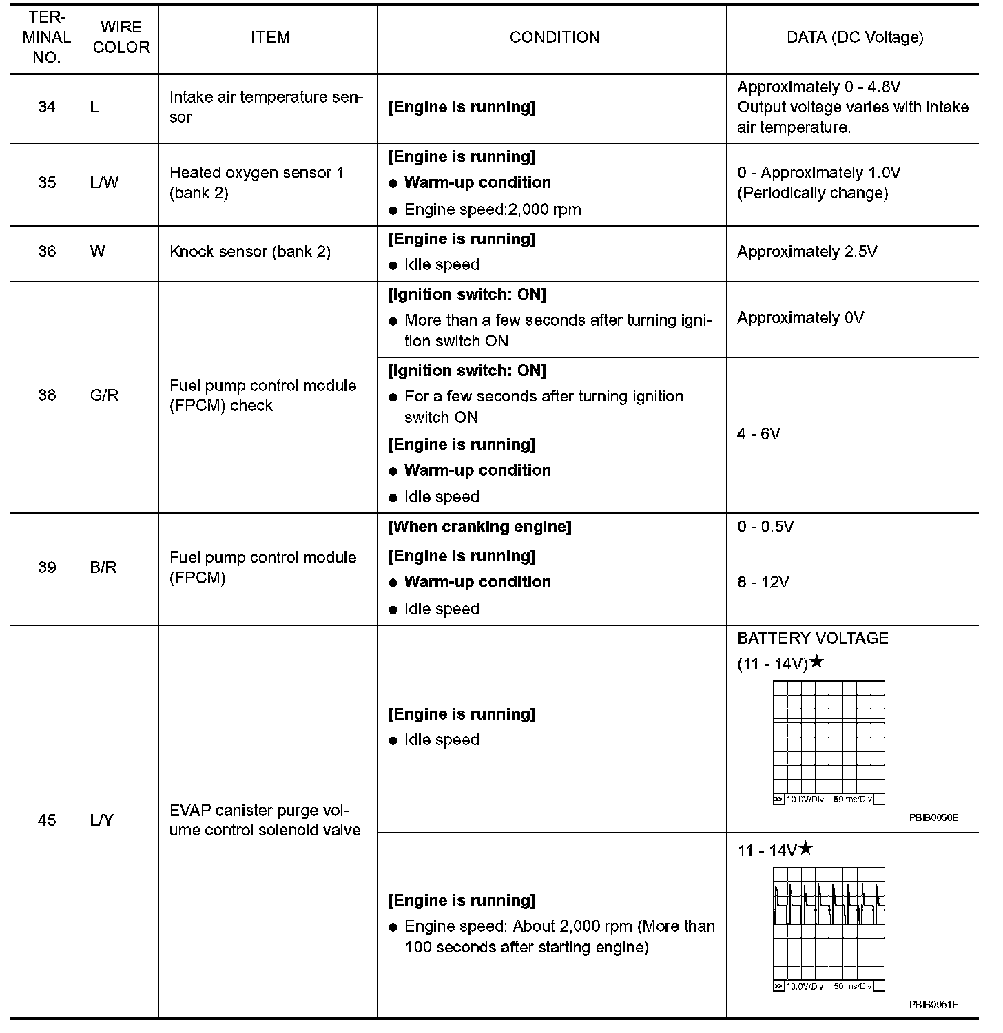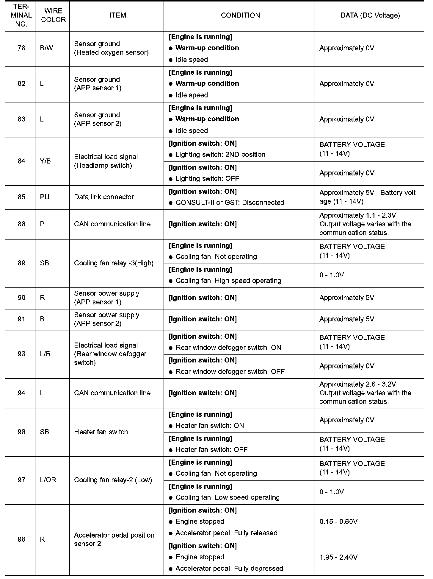 Specification data are reference values and are measured between each terminal and ground. Pulse signal is measured by CONSULT-II.