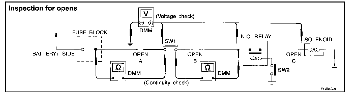 - Connect the other probe to the fuse block (power) side of SW1. Little or no resistance will indicate that portion of the circuit has good continuity. If there were an open in the circuit, the DMM would indicate an over limit or infinite resistance condition. (point A)