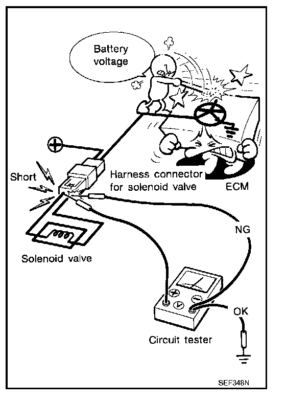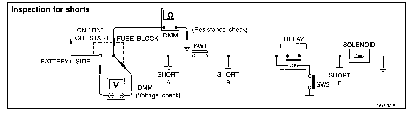 voltage; short is down the circuit of the relay or between the relay and the disconnected solenoid (point C).