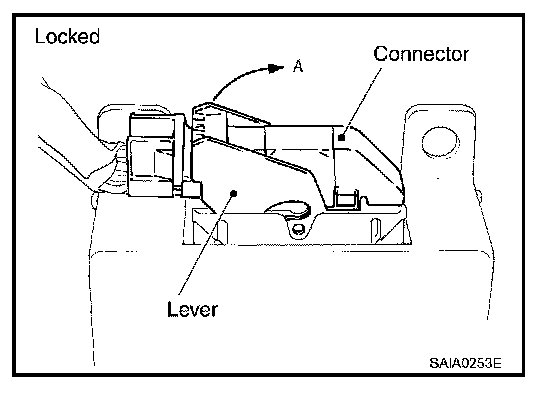 - For removal of the lever type connector, pull the lever up to the direction pointed to by the arrow A in the figure, and then remove the connector.