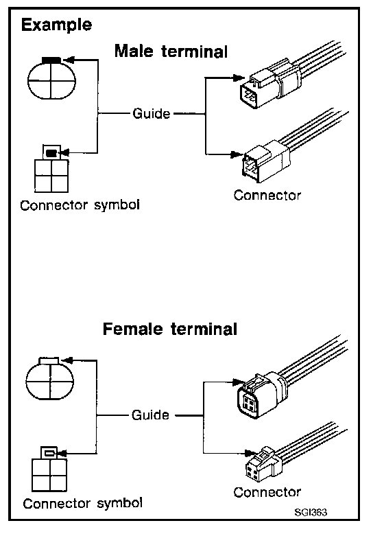 Connector guides for male terminals are shown in black and female terminals in white in wiring diagrams.