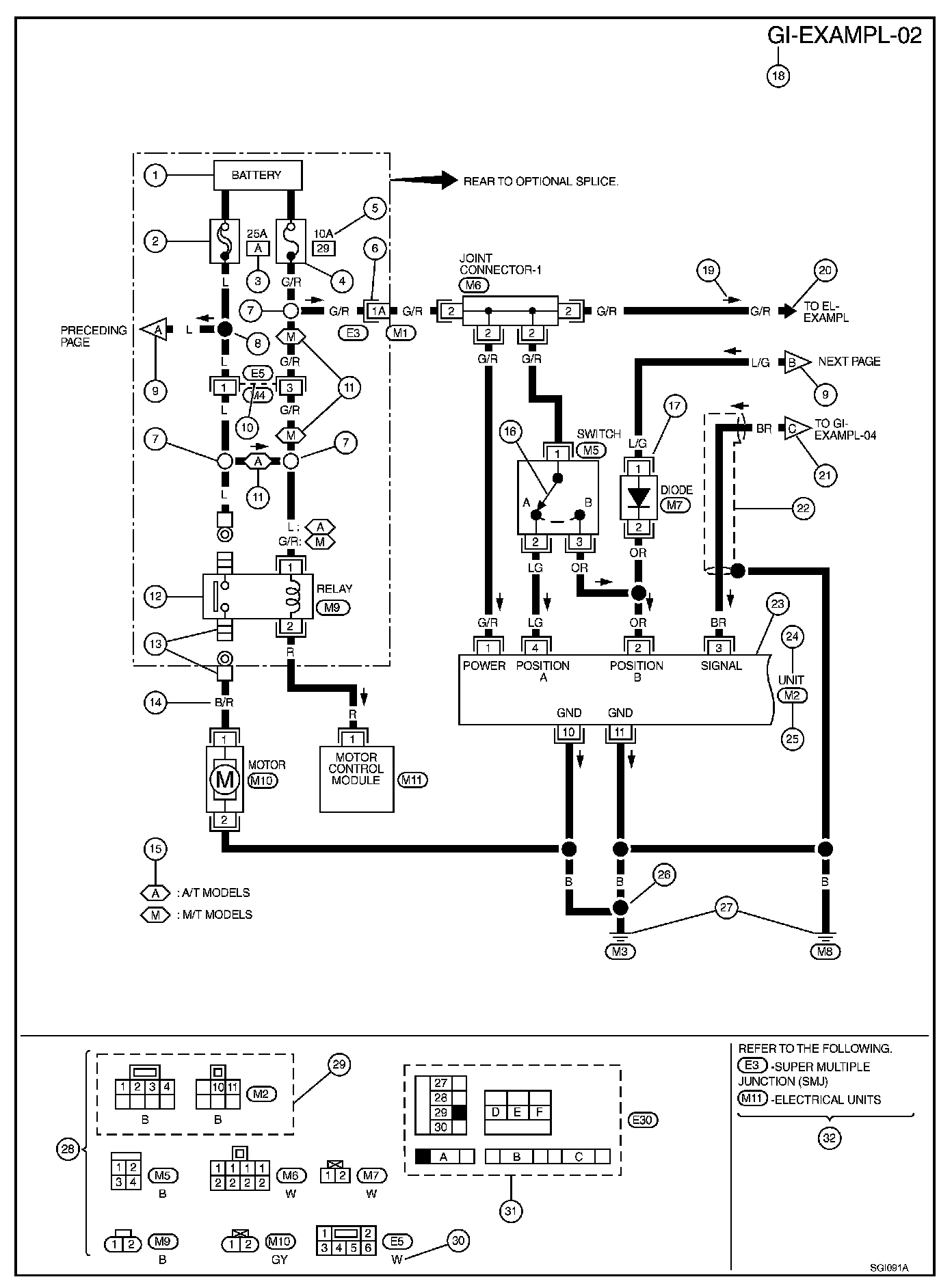 - Connector numbers in a single circle M33 indicate harness connectors.