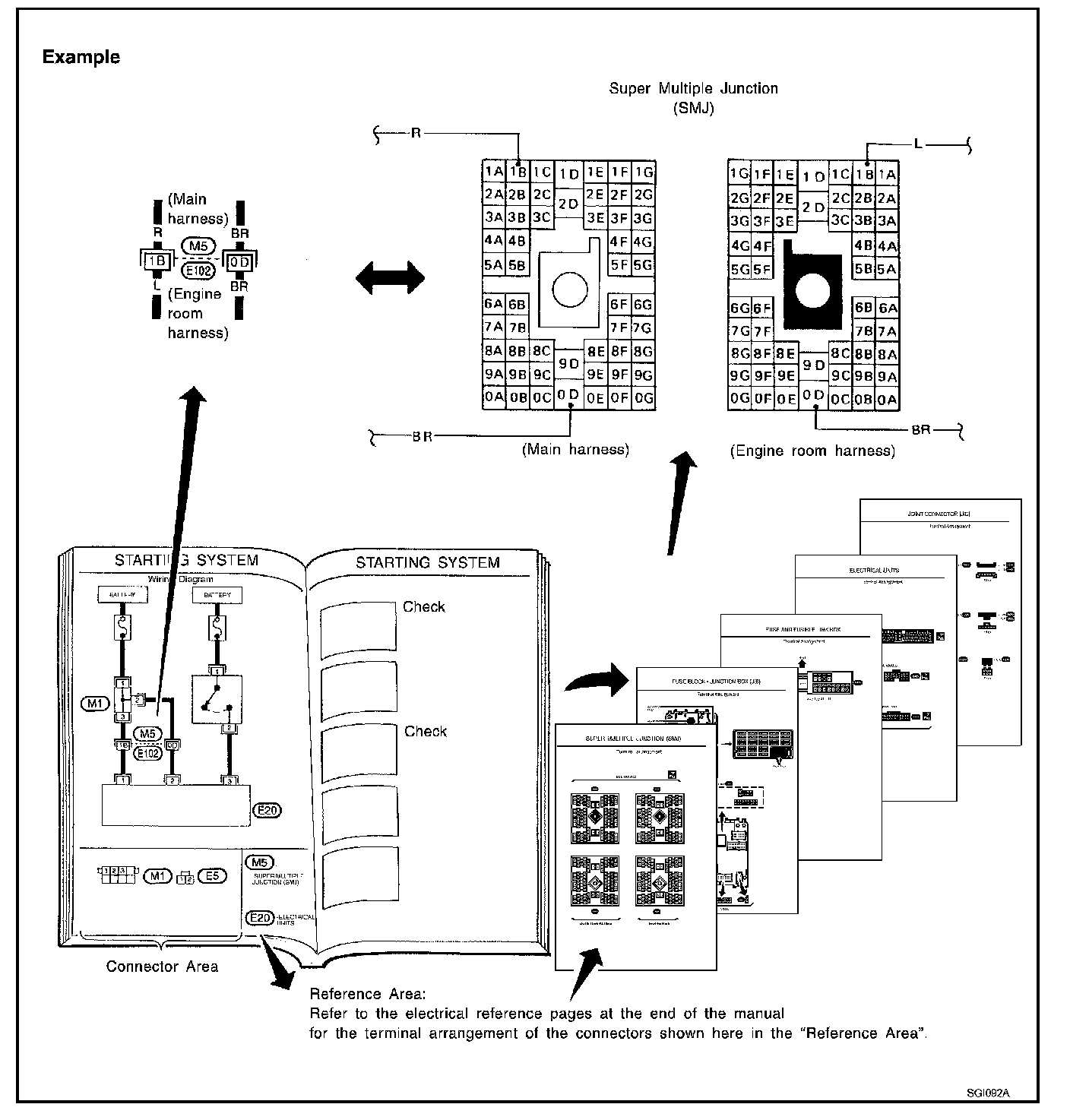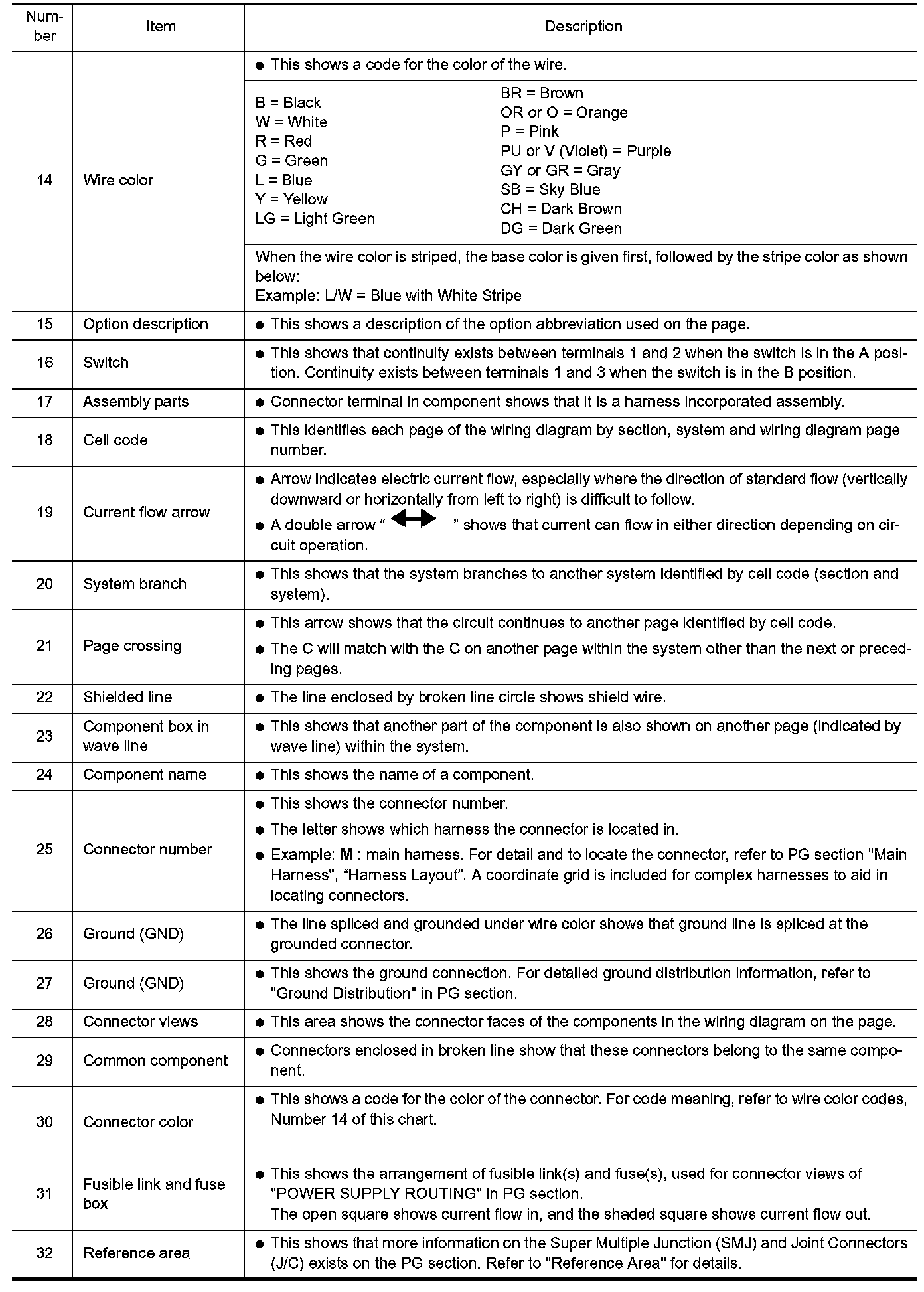 The Reference Area of the wiring diagram contains references to additional electrical reference diagrams at the end of the manual. If connector numbers and titles are shown in the Reference Area of the wiring diagram, these connector symbols are not shown in the Connector Area.