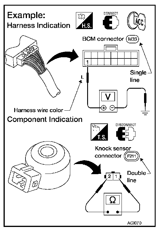 - Connector symbols shown from the harness side are enclosed by a double line and followed by the direction mark.