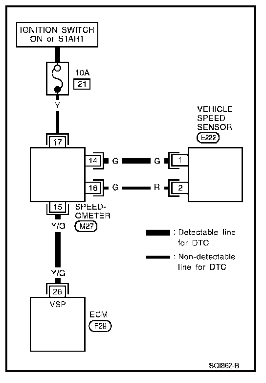 - A line with regular weight (wider line) represents a "detectable line for DTC (Diagnostic Trouble Code)". A "detectable line for DTC" is a circuit in which ECM can detect its malfunctions with the on board diagnostic system.