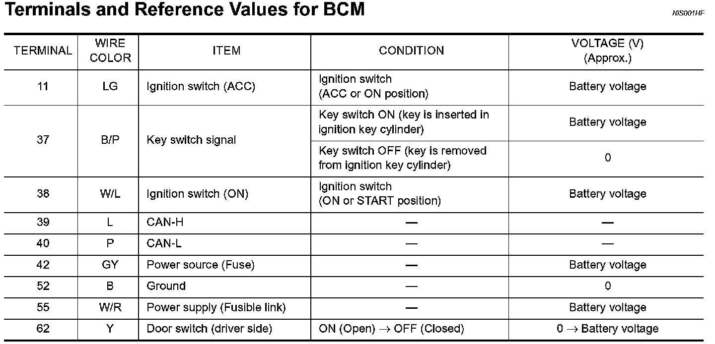 Terminals And Reference Values For BCM: