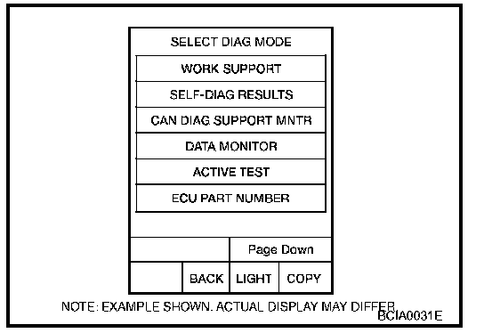 6. Select diagnosis mode. "DATA MONITOR", "ACTIVE TEST", "SELF-DIAG RESULTS", "ECU PART NUMBER" and "WORK SUPPORT" are available.