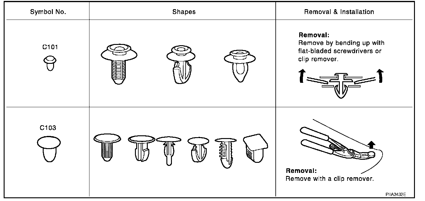 Clips and fasteners correspond to the following numbers and symbols.
