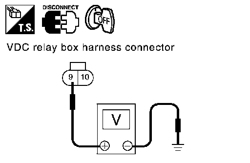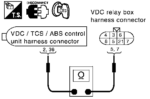 1. Turn ignition switch OFF and disconnect VDC/TCS/ABS control unit connector and VDC relay box connectors. Then reconnect it securely.