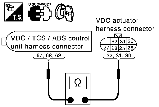 1. Turn ignition switch OFF and disconnect VDC actuator (pressure sensor) connector and VDC/TCS/ABS control unit connector.