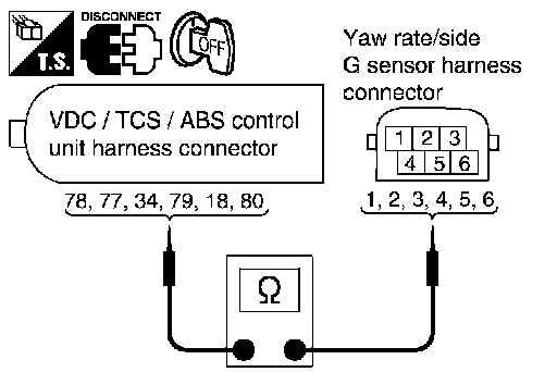 1. Turn ignition switch OFF and disconnect yaw rate/side G sensor connector and VDC/TCS/ABS control unit connector.