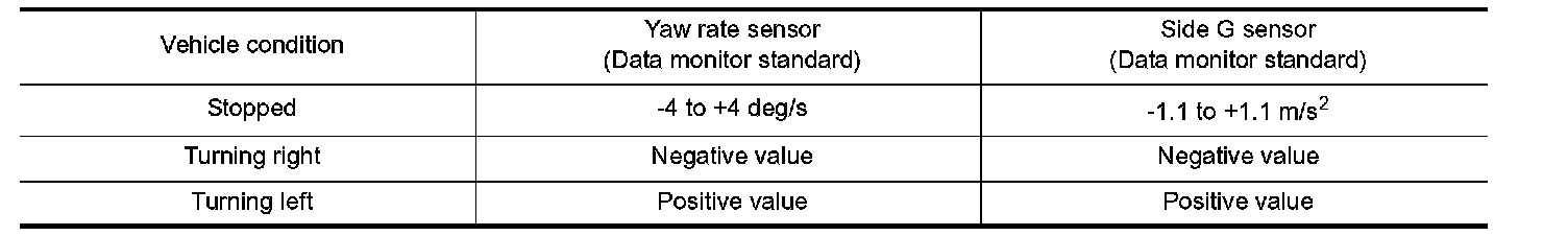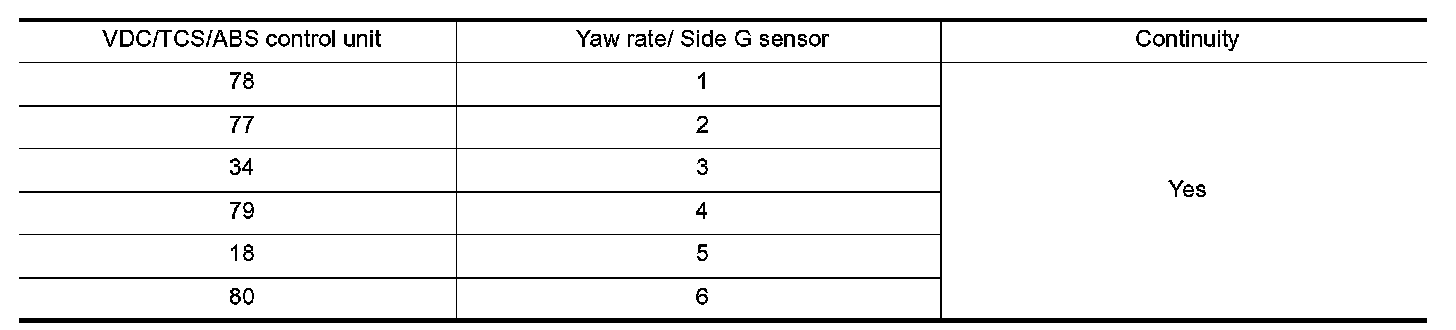 Yaw Rate/Side G Sensor SystemCAUTION: Sudden turns (such as spin turns, acceleration turns), drifting, etc.; when VDC function is OFF (VDC OFF indicator lamp is turned on) may cause yaw rate/side G sensor circuit to indicate a malfunction. However, this is not a malfunction, if normal operation can be resumed after restarting engine. Then erase memory of self-diagnosis.
