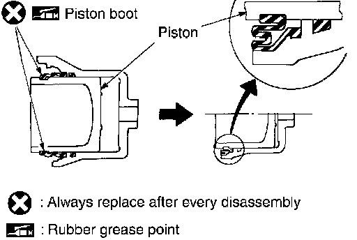 2. Apply rubber grease to piston boot. Cover the piston end with the piston boot, and then install cylinder slide lip on the piston boot securely into the groove on cylinder body.