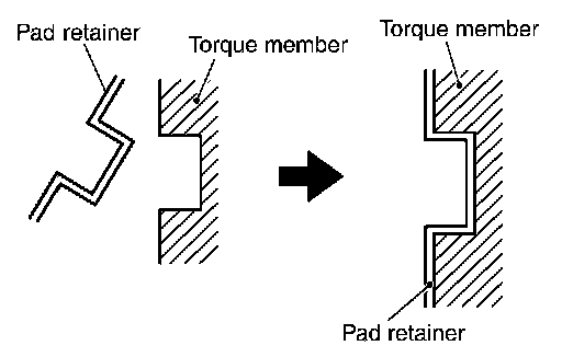 CAUTION: When attaching the pad retainer, attach it firmly so that it does not float up higher than the torque member, as shown in the figure.