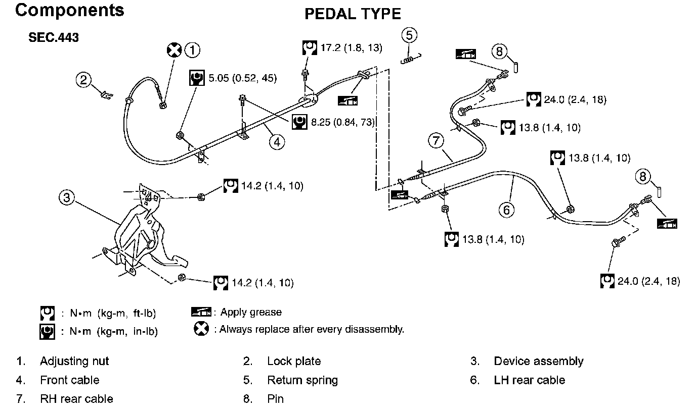 10. Remove front cable mounting nuts and bolts (pedal type), and remove front cable from vehicle.