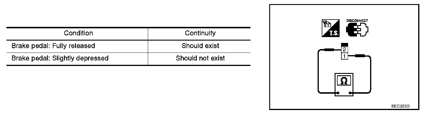 3. Check continuity between ASCD brake switch terminals 1 and 2 under the following conditions.