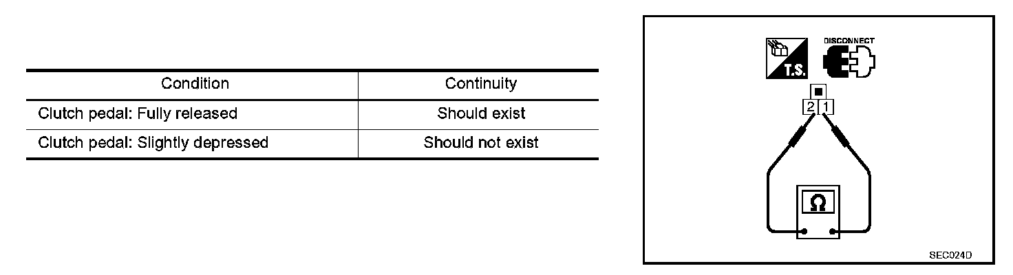 3. Check continuity between ASCD clutch switch terminals 1 and 2 under the following conditions.