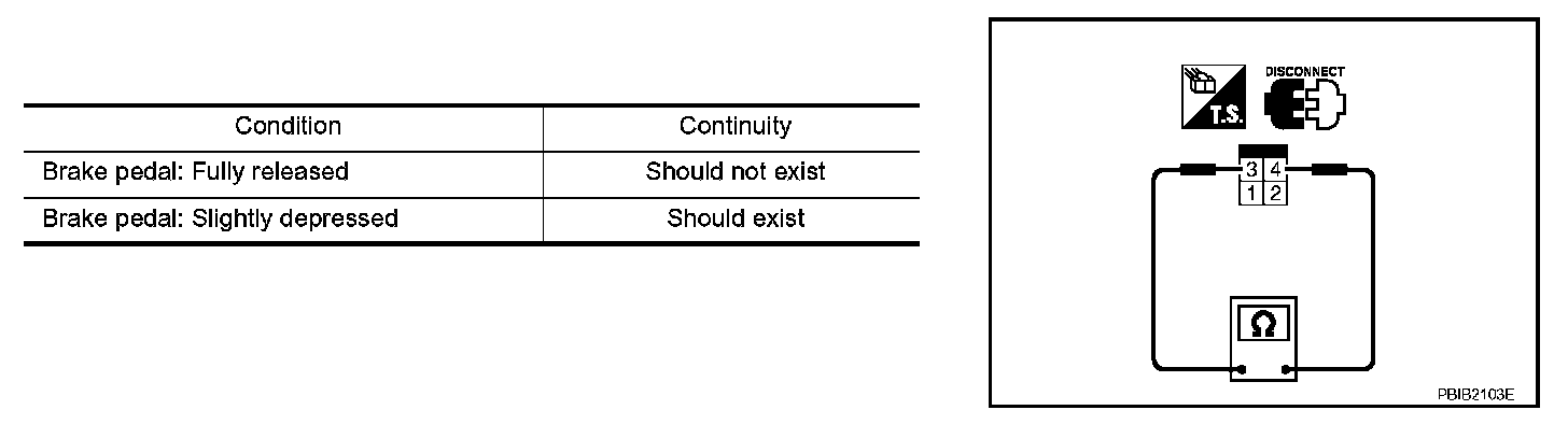 3. Check continuity between stop lamp switch terminals 3 and 4 under the following conditions.