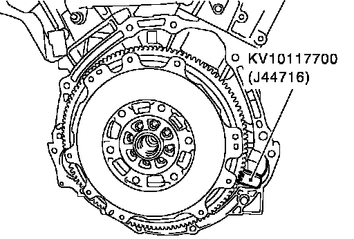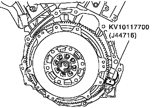 ^ Holding ring gear with ring gear stopper [SST: KV10117700 (J44716)].