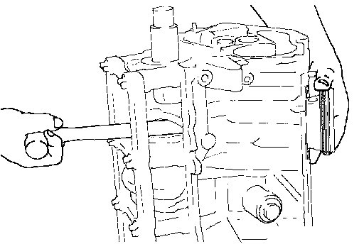 ^ Using main bearing cap bolts, remove main bearing cap while shaking it back-and-forth.