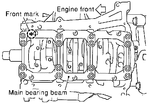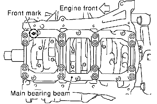 ^ Install main bearing beam with front mark facing downward (oil pan side).
