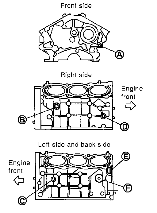 7. Drain engine coolant by removing water drain plugs from cylinder block both sides at B and C and cylinder block front side at A as shown in the figure.