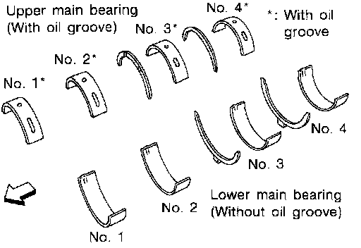 ^ Before installing main bearings, apply engine oil to the bearing surface (inside). Do not apply engine oil to the back surface, but thoroughly clean it.