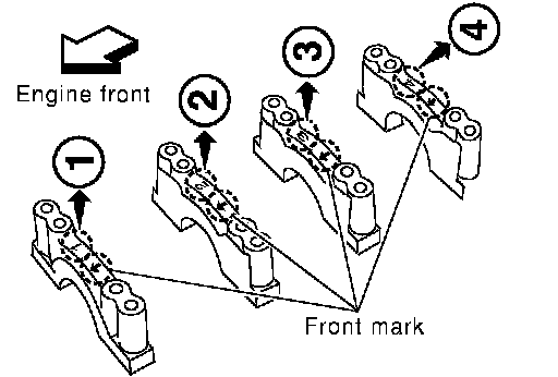 ^ Main bearing caps are identified by identification mark cast on them. For installation, face front mark to front side.