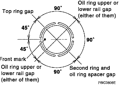 ^ Position each ring with the gap as shown in the figure referring to the piston front mark.