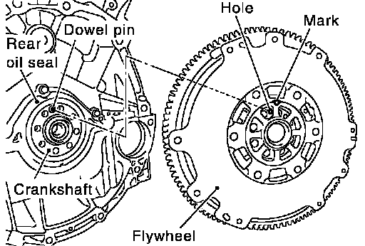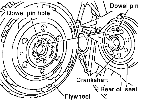 ^ When installing flywheel to crankshaft, be sure to correctly align crankshaft side dowel pin and flywheel side dowel pin hole.