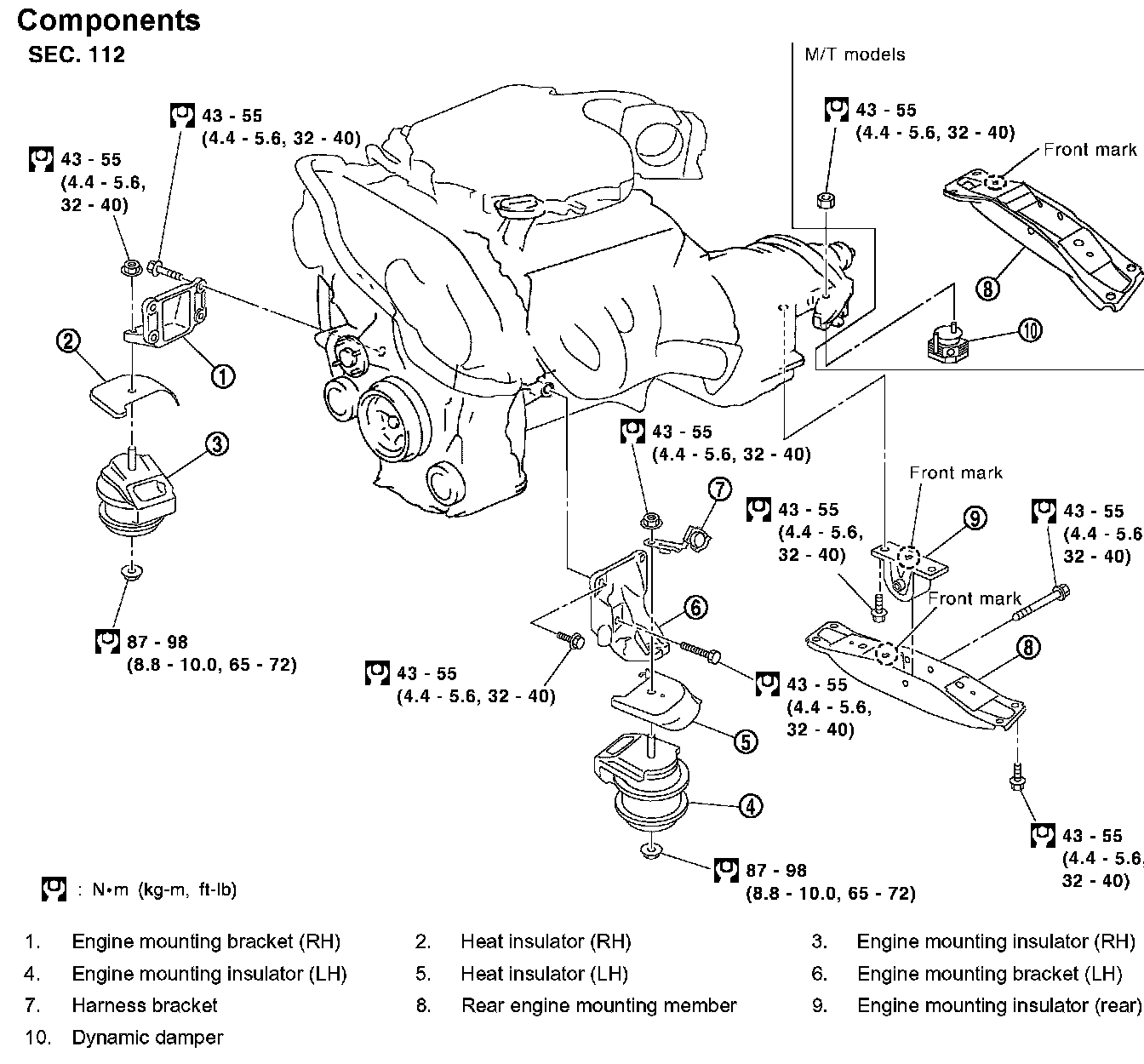 9. Remove engine mounting insulator (rear) and bracket (rear) from transmission.