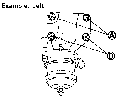 ^ When installing engine mounting brackets (RH and LH) on cylinder block, tighten two upper bolts (shown as A in the figure) first. Then tighten two lower bolts (shown as B in the figure).