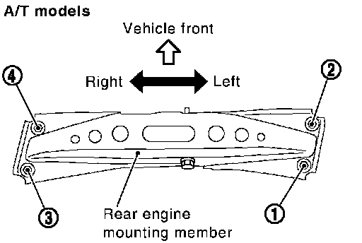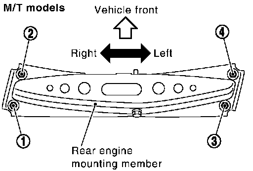 ^ Tighten rear engine mounting member bolts in numerical order as shown in the figure.
