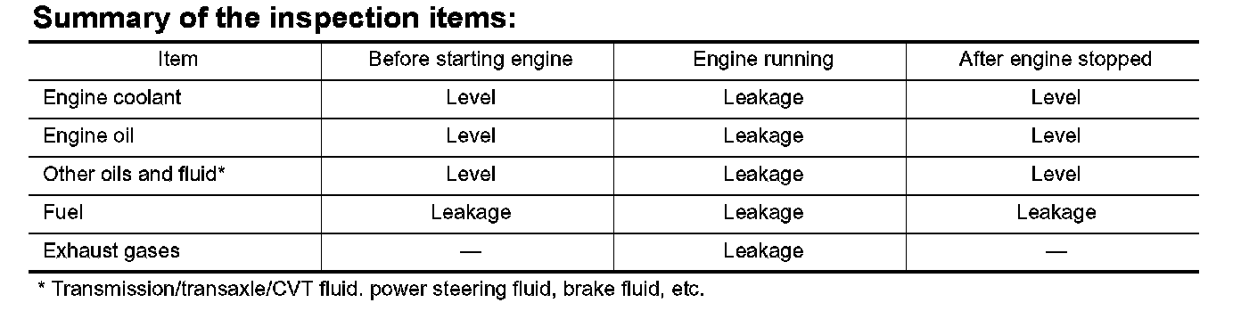 The following are procedures for checking fluids leak, lubricates leak and exhaust gases leak.