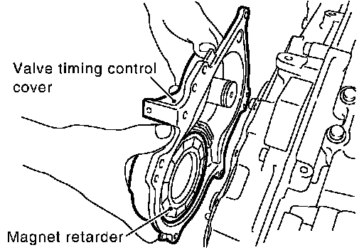 ^ When carrying valve timing control cover, face the magnet retarder side up to prevent the cover from falling from magnet retarder.