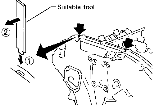 b. Insert suitable tool into the notch at the top of the front timing chain case as shown (1).
