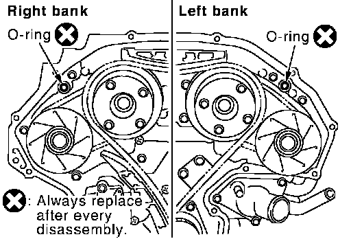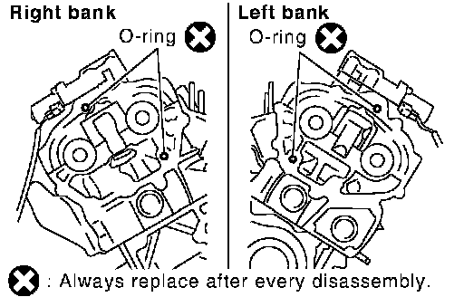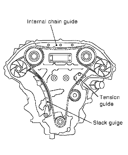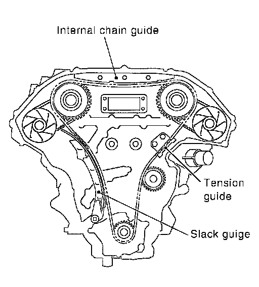 NOTE: If hydraulic pressure inside timing chain tensioner drops after removal/installation, slack in the guide may generate a pounding noise during and just after engine start. However, this is normal. Noise will stop after hydraulic pressure rises.