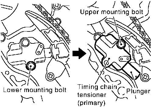 b. Loosen upper mounting bolt slowly, and then turn timing chain tensioner (primary) on the mounting bolt so that plunger is fully expanded.