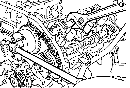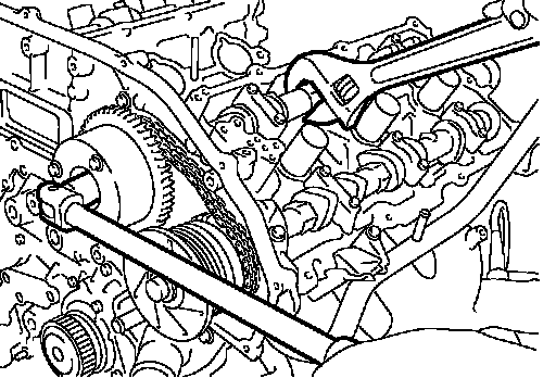 ^ Secure the hexagonal portion of camshaft using wrench to loosen mounting bolts.