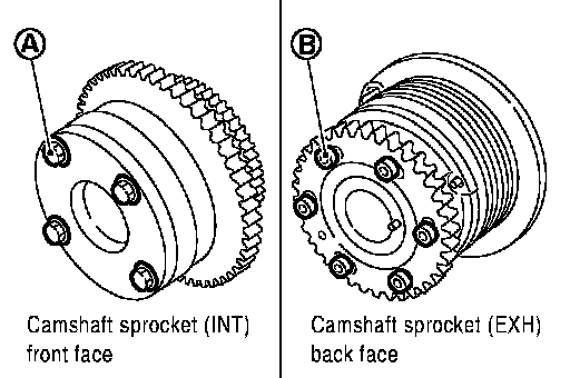 ^ Mating marks for intake camshaft sprocket are on the back side of camshaft sprocket (secondary).