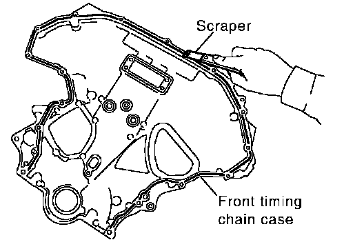 35. Use scraper to remove all traces of old liquid gasket from front and rear timing chain cases, and opposite mating surfaces.