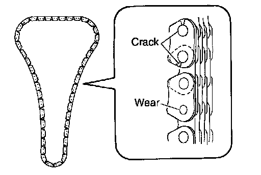 Check for cracks and any excessive wear at link plates and roller links of timing chain. Replace timing chain as necessary.