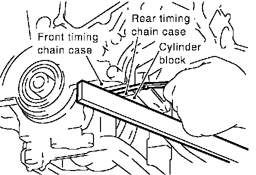 ^ After removal, handle front timing chain case carefully so it does not tilt, cant, or warp under a load.