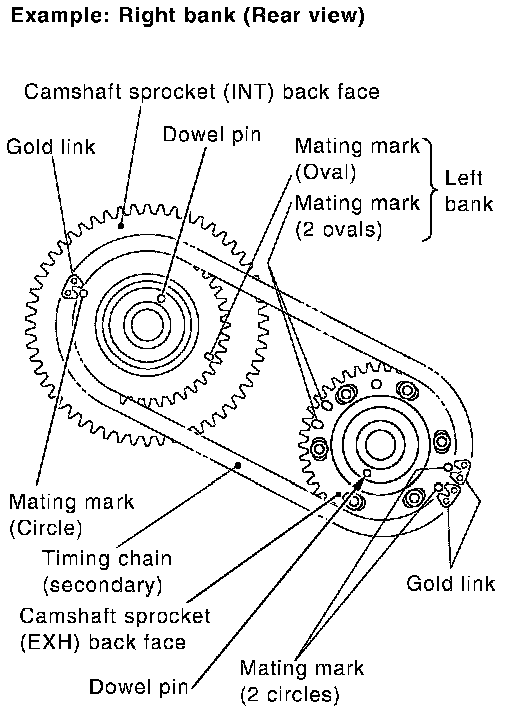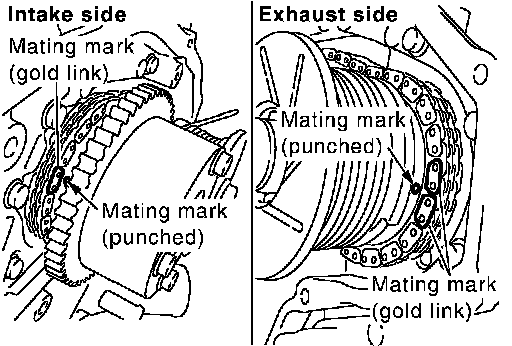 ^ Make sure the mating marks (punched) on each camshaft sprocket are positioned on the mating marks (gold link) on timing chain (secondary).