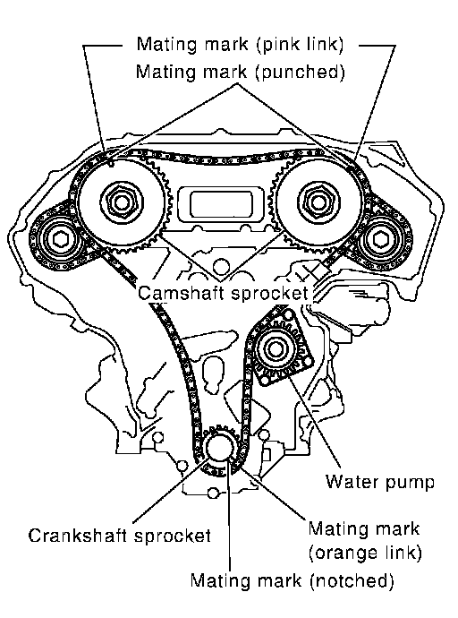 10. Make sure again that the mating marks on sprockets and timing chain have not slipped out of alignment.