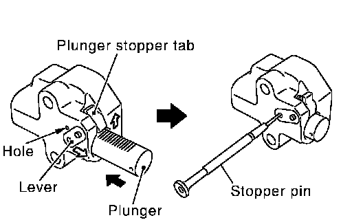 d. To secure lever, insert stopper pin through hole of lever into tensioner body hole.